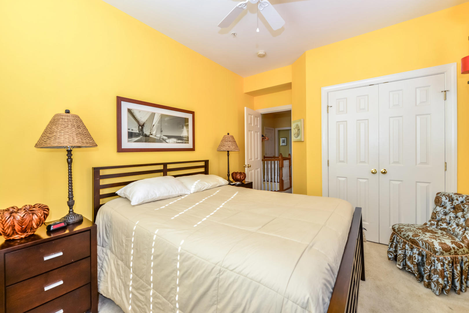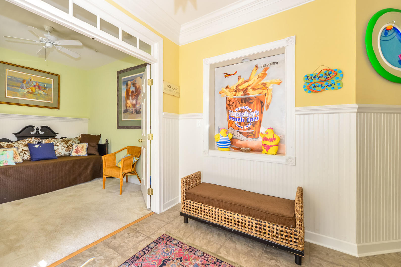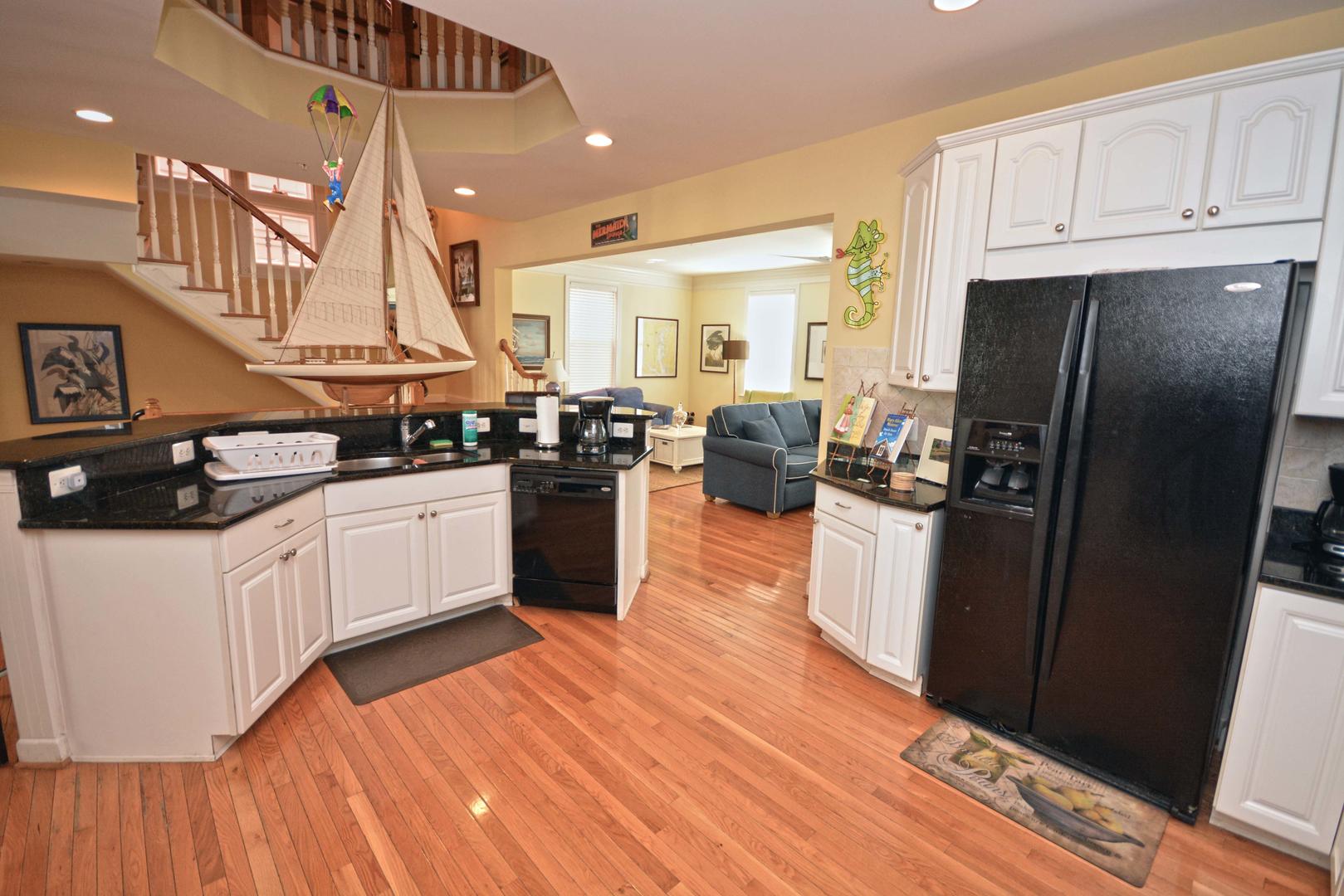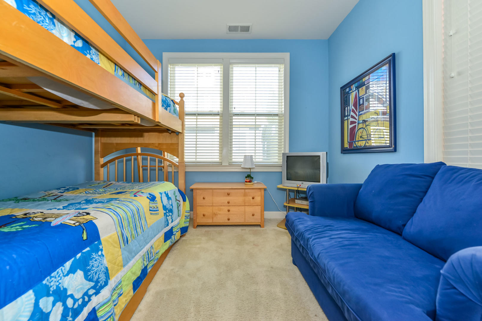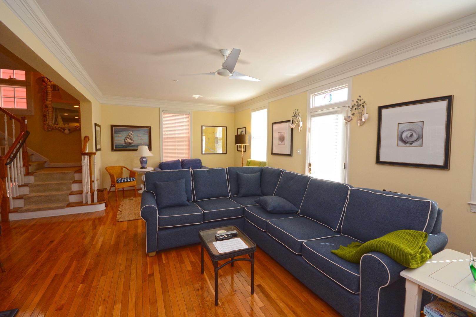 Sunset Island 30 is a modern bayside house located in a gated community. This six-bedroom, four and a half-bathroom single-family home has a balcony overlooking a peaceful, family-friendly neighborhood. This unit is the perfect place for you and your family to call home for a week! Sunset Island 30 is one of Ocean City's finest vacation rentals. The delightful living room is furnished with sectional sofa, loveseat, arm chair, fireplace and a television. The full glass door and multiple windows for allow plenty of natural light to brighten the space. Next to the living room is the spacious, fully-stocked kitchen with a granite counters and an island, just right for grabbing a quick bite. Right off the kitchen is a dining area, perfect for delicious meals with the family. The master bedroom has a king-size bed, television, and a private bathroom. The second bedroom has a queen-size bed and a television. The third bedroom has a double bed, and a television. The fourth bedroom has a bunk bed and a couch. The third full bathroom is located in the third-floor hallway. The fourth floor has a nice sitting area with a couch, a chair and a television. The fifth bedroom is also located on the fourth floor and has a double bed and a rocking chair. The fourth full bathroom is located on the fourth floor in the hallway. The sixth bedroom is on the bottom floor and has a daybed, a trundle bed, a wicker chair and a television. This property comfortably sleeps up to twelve people, so bring the whole family! Sunset Island 30 has the following amenities: Central HVAC, three parking spaces, garage, five Smart TVs, free WiFi, full-size washer and dryer, fireplace, refrigerator, ceiling fans, microwave, coffee maker, toaster, stove, disposal and dishwasher. Sunset Island Community features the following amenities: indoor and outdoor pool, kiddie pool, private beaches, sun deck, island cafe and bar, interactive fountains, gym/fitness center, walking trail, security guards and an outdoor foot shower. Six facility passes provided. Additional passes are $70 each at the Sunset Island clubhouse. Bed Sizes: BR1: King BR2: Queen BR3:Double/Full BR4: Bunk Beds BR5: Double BR6/Den: Daybed with Trundle This property does not allow pets or smoking. Shoreline Properties rents to families and responsible individuals over the age of 25. Come stay at Sunset Island and create wonderful memories to last you and your family a lifetime!