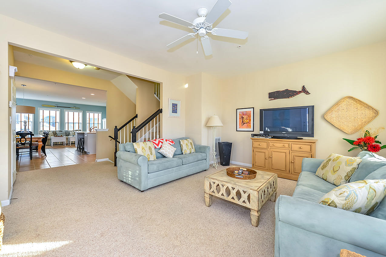 The spacious, beachy living room is furnished with comfy couches and a television. The larger couch doubles as a queen-size sleep sofa. The glass-paneled door allows plenty of natural light to brighten the space. Right off the living room is a large dining area, so the whole family can enjoy meals together. Next to the dining area is the fully-stocked kitchen with an island, just right for grabbing a quick bite. Behind the kitchen is another sitting area, furnished with a couch, chairs, and a television. Also off the kitchen is a half-bathroom. On the third floor, you'll find most of the bedrooms. The master bedroom has a king-size bed, a television, and a private bathroom. The second and third bedrooms both have two twin beds. The second full bathroom is located in the third-floor hallway. The fourth floor is the loft, which houses the fourth bedroom and the third full bathroom. The fourth bedroom has a queen-size bed, a television, and balcony access. The fifth bedroom is located on the bottom floor and has a daybed with a trundle bed, and a television. A second half-bathroom is also located on the bottom floor. This property comfortably sleeps up to nine people, so bring the whole family!