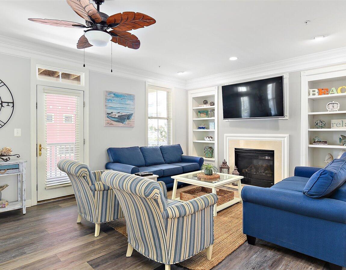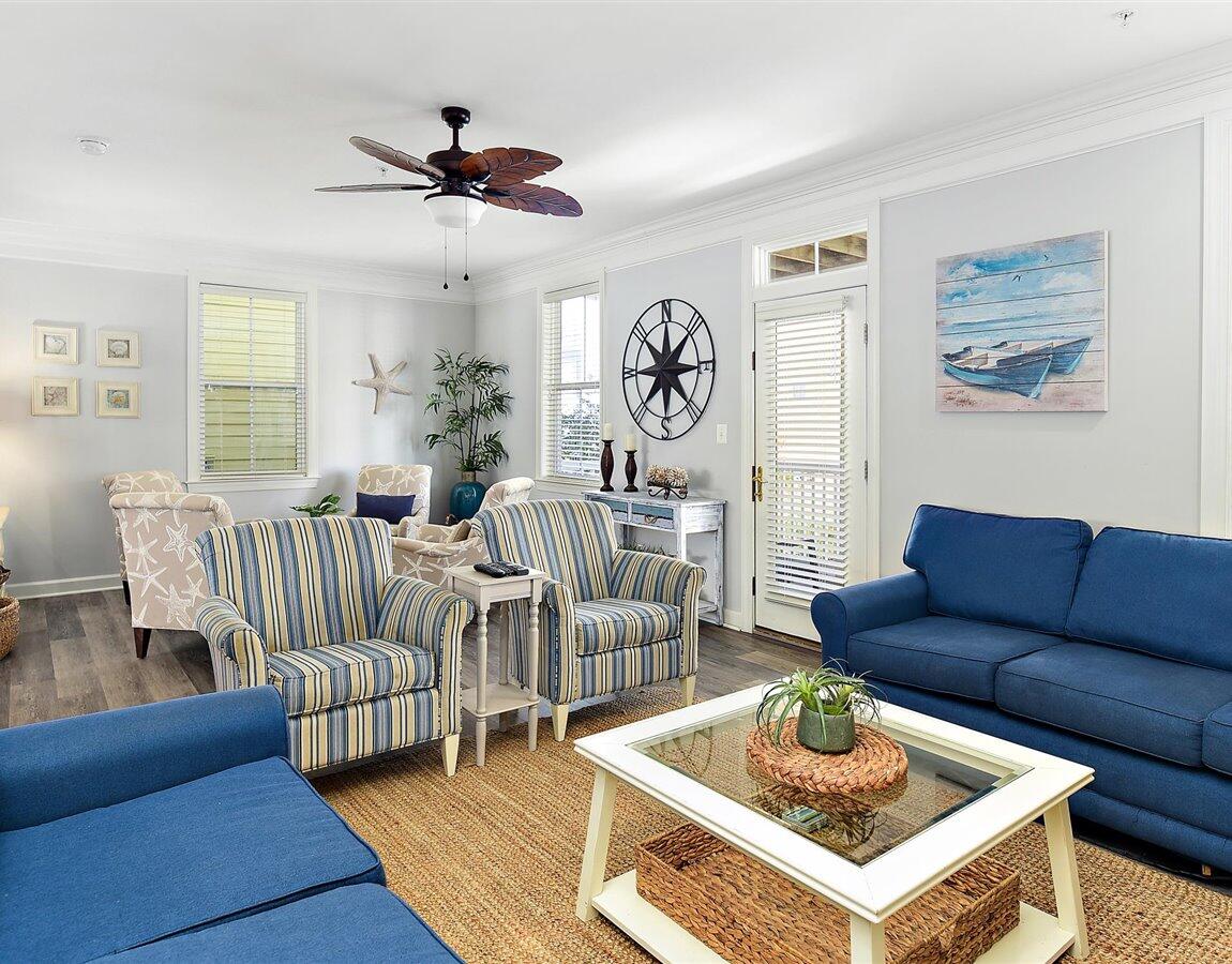 Sunset Island 6 Shore Point Drive is a luxurious 6 bedroom, 4 1/2 bathroom single family home with bay views is located in the gated community with a family-friendly neighborhood. This single family home is one of the finest in Ocean City and the perfect place for you and your family to call home for a week! This spacious, professionally decorated 6 bedroom single family home boasts numerous upgrades throughout with beautiful coastal decor, new furnishings and custom paint. Numerous upgrades throughout. The bright and open living area has lots of natural light with windows and balcony doors. There is 2 large sofas, 2 arm chairs with built in fireplace, bookcases and a large, flat screen television. Adjacent to the living room is 4 occasional chairs and a table to provide additional seating. A large kitchen with a granite island has more seating for guests to enjoy a quick snack or beverage. A full size dining table is off the kitchen and a half bath completes the living area. The third floor has the master bedroom with a king-size bed, a television and a private master bathroom with a double vanity, garden tub and a separate shower. Bedrooms 3 & 5 offer queen beds and televisions. The 4th bedroom has two twin beds with a television. A full size bathroom is located in the hallway. The 6th bedroom has a queen bed and television along with a loft area with a full sofa. There is also a full bathroom on this level. The entry level bedroom has a queen bed and full size bathroom in the hallway. This property comfortably sleeps up to twelve people, so bring the whole family! Bed Sizes: Bedroom 1: King Bedroom 2: Queen Bedroom 3: Two Twins Bedroom 4: Queen Bedroom 5: Queen Bedroom 6/Entry Level: Queen Bed Sunset Island 6 has the following amenities: central air conditioning, seven televisons, cable TV, free WiFi, full-size washer and dryer, refrigerator, microwave, coffee maker, toaster, cook top stove, ovens, dishwasher and disposal. Sunset Island has the following amenities: indoor and outdoor pool, kiddie pool, private beaches, sun deck, island cafe and bar, interactive fountains, gym/fitness center, walking trail and security guards. Three car parking with townhouses and single family rentals, two car parking included with condo rentals. Six facility passes are included, additional passes are $70 each at the Sunset Island clubhouse. This property does not allow pets or smoking. Shoreline Properties rents to families and responsible individuals over the age of 25. Come stay at Sunset Island and create wonderful memories to last you and your family a lifetime!